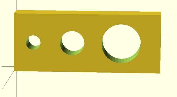 Suponiendo que tengo que imprimir vertical, como se muestra en la imagen, tengo que hacer una llamada. Las imágenes cuentan con tres agujeros, de diámetros de 3mm, 5mm y 8mm de izquierda a derecha. Plástico tiene cierta rigidez, por lo que puedo imprimir el agujero 3mm bien como es. El agujero de 5mm tendría poco caídos de plástico y tendría que ser taladrado. El agujero de 8mm es probable que imprimiría extremadamente mal.