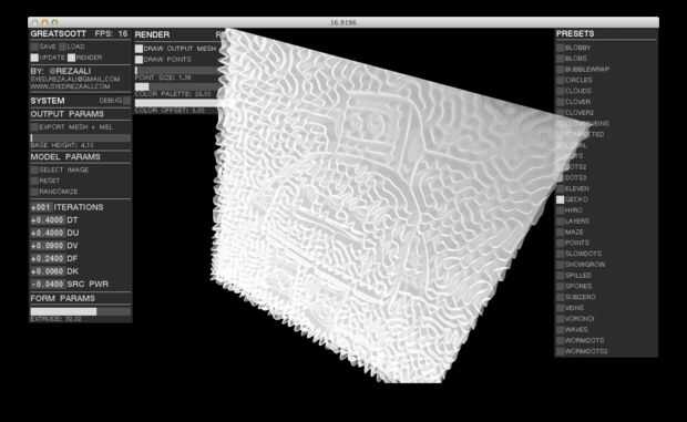 Así que jugar con la aplicación y generar un patrón que parece interesante! Una vez que estés listo para exportar la geometría, pulse el botón "exportar malla + MEL". Esto generará una malla cerrada del estado actual de la visualización. La malla está guardada dentro de la carpeta de datos: datos, capas, GreatScottLater, activos/modelo