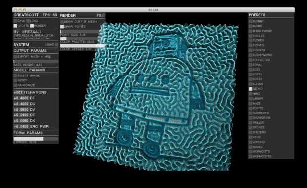 El panel de "GREATSCOTT" le permite guardar y cargar ajustes preestablecidos. El "actualización" y "RENDER" alterna de control si la aplicación es actualización y representación de la simulación de RD.