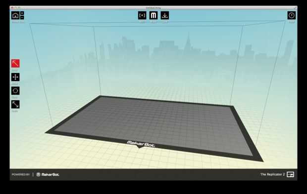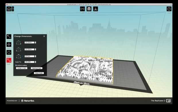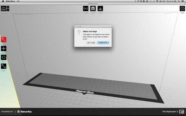 Abrir la aplicación MakerWare y cree un nuevo archivo (segunda foto). A continuación, importar un modelo presionando el botón "Añadir" . Una vez que haya hecho su selección, MakerWare le dirá el objeto es demasiado grande (como se muestra en la tercera foto), y eso está bien. Basta con presionar "escalar para encajar" a escala del modelo para caber dentro de área de construcción de Makerbot (el resultado final debería verse como la cuarta foto).