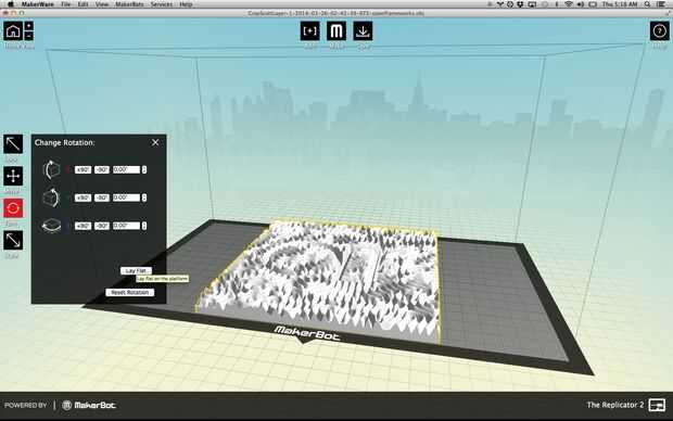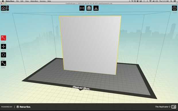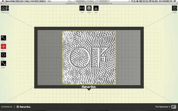 Con respecto a la impresión 3D, recomiendo siguiendo las instrucciones de impresión para la impresora 3D que estará trabajando con. Las siguientes instrucciones son para un Makerbot Replicator 2 (Makerware 2.4.1.35).