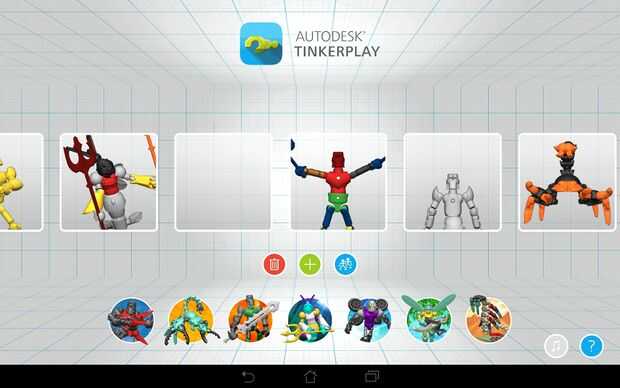 Diseño 3D normalmente requeriría software costoso y la experiencia, especialmente para modelar piezas detalladas con bola y zócalo empalmes. Con Tinkerplay es fácil para un principiante seleccionar de la gran biblioteca de piezas y mezclar y combinar cabezas, torsos, brazos, piernas y otros apéndices y accesorios para crear un personaje personalizado en 15 minutos. La aplicación incluso le permite posar tu personaje y ver su rango de movimiento. cuando tu feliz con tu personaje puede añadir color a las piezas.