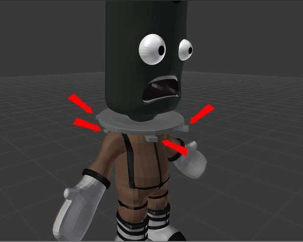Presté especial atención a la zona donde el casco 'Únete' sobre el carácter Kerbal. Esta parte era difícil de hacer bien y tomó algunas pruebas e iteración del diseño. Necesitaba el agujero en el casco a la línea de arriba con el disco, sin el área de fijación de disco es demasiado grande que parecía estúpido y sin el agujero del casco es demasiado pequeño que no cabe en la cabeza de kerbals.