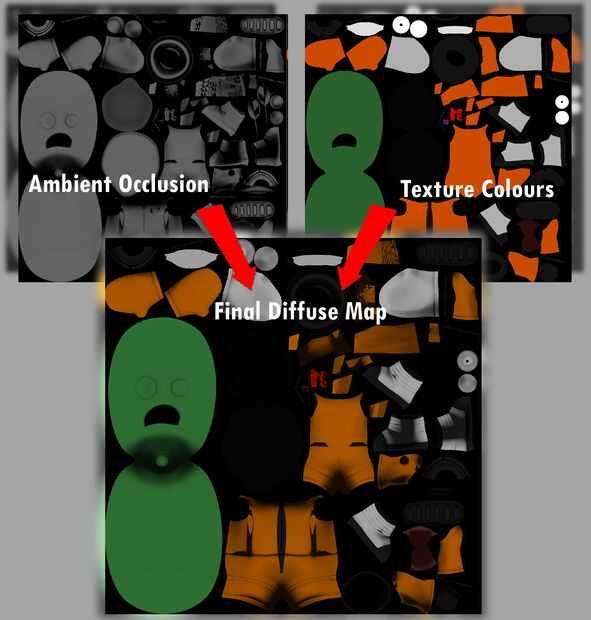Los mapas de dos textura al horno (un pass de oclusión ambiental y un pase de color) fueron combinados y ajustados para hacer el mapa difuso final.