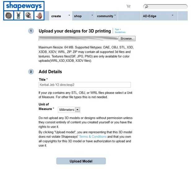 Desde aquí me podrian mandar el modelo a Shapeways Impresión, pero probablemente dejaría durante la comprobación automatizada. Theres una cosa a la izquierda para ajustar - el tamaño del modelo.