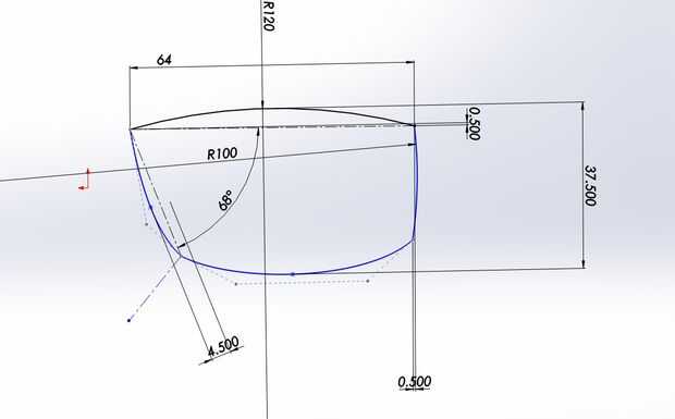 Primero nos esboza un esquema del marco de la incorporación de las dimensiones generales. Para la curva superior y exterior utilizo arcos, la parte inferior y curva interior utilizar splines. Arcos que sea más fácil restringir el dibujo, aunque también es una opción de diseño.