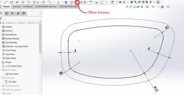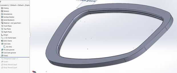 Para crear la ranura para ajustar la lente en, creamos un plano con un desvío de al menos 0,8 mm del plano base, un desplazamiento de dibujo hacia el exterior mm 0,5 del último sketch creado y extruir corte este hasta una profundidad igual al espesor de su material de la lente más un juego adicional de al menos 0,2 mm a cuenta para impresión inexactitudes en el 3D. También he añadido un filete hasta el borde donde encaje la lente en el marco para un ajuste más fácil.