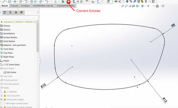 Luego para completar el cuadro, crear un dibujo diferente e importar el boceto base previamente creado con el comando 'Convertir entidades' en la barra de herramientas Dibujo. Luego agregar los redondeos. La razón por qué crear un dibujo nuevo es mantener el diseño de la base para la fácil modificación, ya que agregar redondeos en el bosquejo original puede eliminar algunas de las limitaciones.