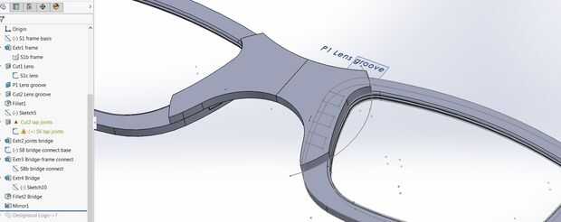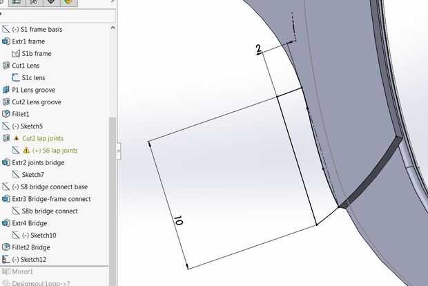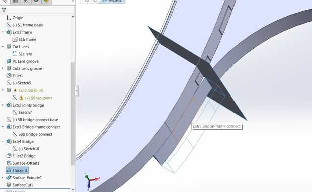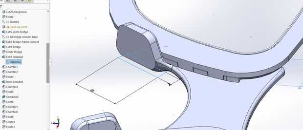 Con la parte superior de la estructura como base, dibujamos el boceto para el puente. Utilizando entidades convertir, copiamos el contorno del marco en el dibujo actual. Dibuje la línea central de las gafas – debe haber unos 12 espacio de mm donde el puente se apoya en la nariz para que la línea central es de 6 mm de la parte exterior del marco. Conecte el bosquejo se puede convertir a la línea central con arcos que son tangentes a la estructura y tienen su centro alineado verticalmente con la línea central. Recorte a las entidades exceso resultará en el contorno de la mitad del puente. Es una buena idea utilizar ahora la función de espejo para comprobar su diseño.