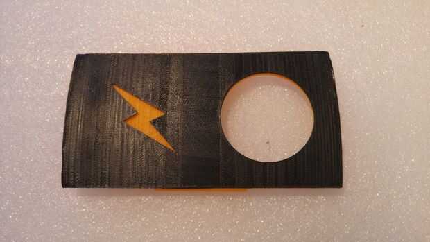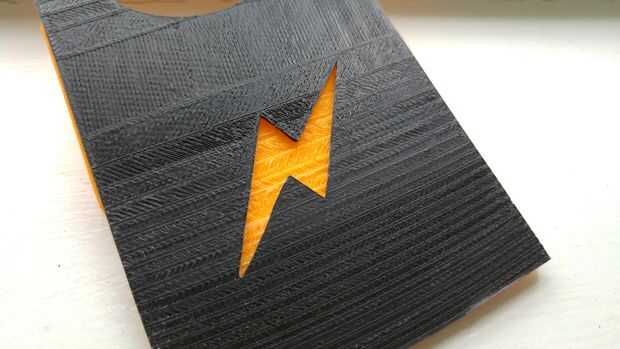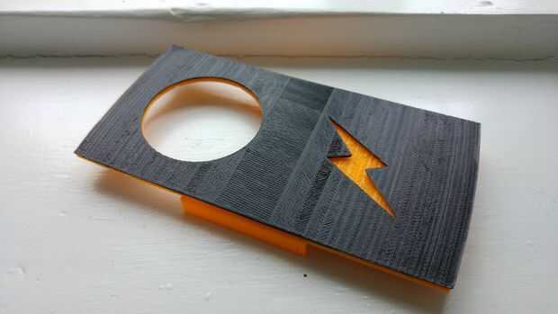 La parte inferior - amarillo - (cerca de la pantalla del teléfono inteligente) se hace con un filamento de color. La parte superior (negro o blanco, pero cualquier combinación de colores puede ser utilizado) replica el agujero de la pantalla y tiene un logo que se puede personalizar como desee. ¿El efecto suena bonito, no?
