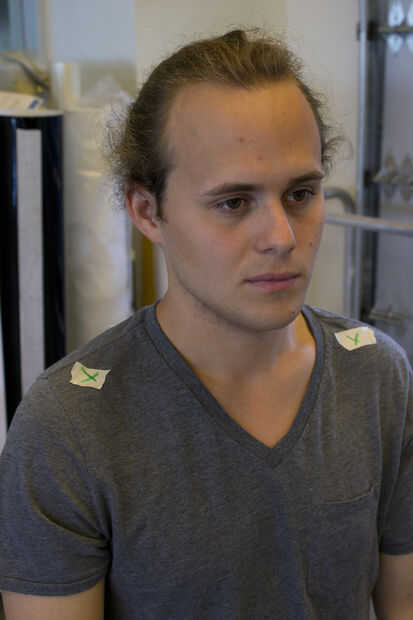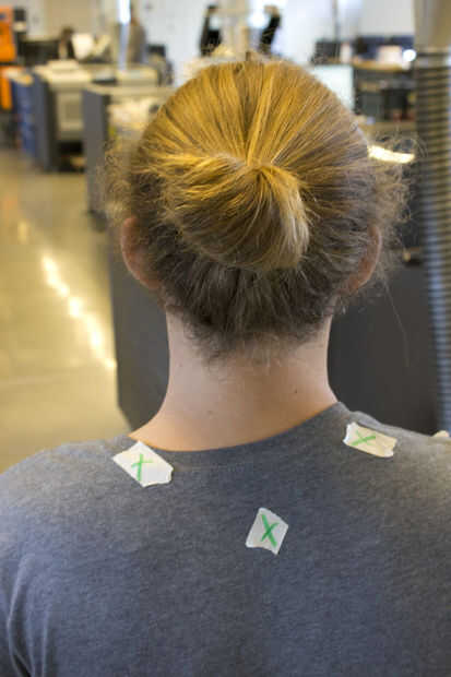 •Coloque los pedazos de cinta adhesiva en el pecho, hombros, cuello y atrás de la cabeza. (Estas características ayudan a 123D Catch reconstruir el modelo)