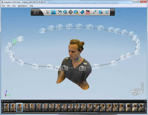 Crear un modelo 3D con Catch 123D puede ser fácil. Básicamente usted dispara una secuencia de fotografías que se superponen a medida que se mueve alrededor de la persona. Por ejemplo, a disparar 20 fotos más o menos poco a poco en un bucle completo de 360 grados para que obtener cobertura total. Puedo disparar a algunos ángulos adicionales de arriba hacia abajo para obtener la parte superior de la cabeza.