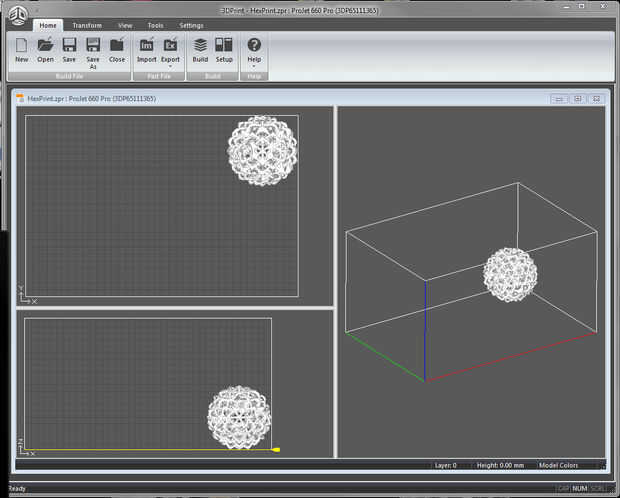 La orientación de su modelo tiene un gran impacto en el tiempo de impresión, debido a la velocidad del eje de impresora 3D diferentes. Como el Projet no necesita imprimir material de 'andamio' como otras impresoras 3D, usted está libre para girar el modelo para hacerlo imprimir tan rápido como sea posible. El eje más rápido es el eje x (lado a lado), seguido por el eje y (adelante hacia atrás). Y el más lento es el eje vertical (como cada nueva capa, tienes que sacar una nueva capa de polvo de base. Generalmente se debe evitar la impresión vertical) así que al colocar el modelo en la cama imprimir, rotar y mover que sea tan corto y tan cerca de la parte posterior de la cama de impresión posible.