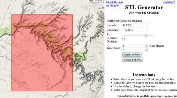 Rápidamente puede obtener un modelo áspero de este sitio web , como se ve en la imagen de abajo. Tipo de coordenadas, o utilizar el centro para ver el botón para hacer una selección, como se ve en el rectángulo rojo. El arco/segundos hacer la selección más grande, o sólo zoom. Finalmente Pulse el botón Crear archivo de STL.