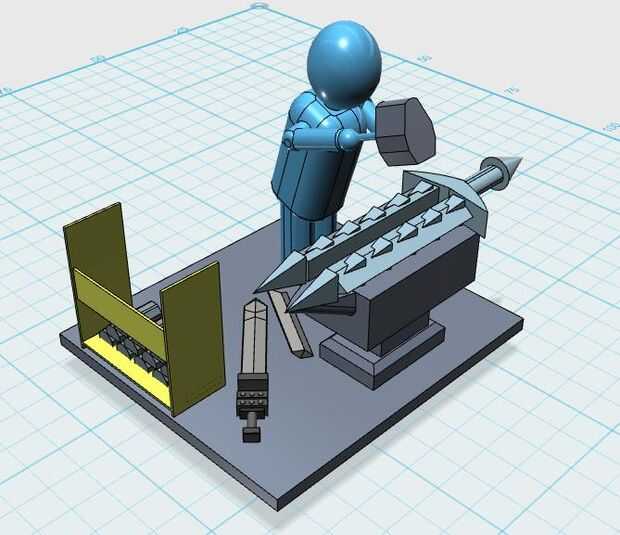En el modelo 3D, construí una tienda de hierro fundido, el Herrero es martilla una espada, mientras que algunos Hierro crudo son en la plataforma y una espada está también en el piso. Esta escena demuestra que a una buena espada no es fácil, necesita ser martillado una y otra vez, y también fracasos va a pasar.