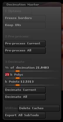 Seleccione Zplugin, Decimation Master y luego todos preprocesar. Cuando haya completado el proceso previo, dar a Decimation Master un recuento de poli blanco, en este caso 25.000. Los otros reguladores se ajustan automáticamente. Seleccione todos diezman y mira el resultado. Si usted necesita ajustar el recuento de poli superior para tratar las áreas de problema, puede deshacer la destrucción y empezar de nuevo.