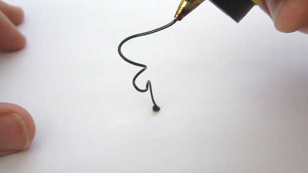 Para hacer una línea recta, mantener el cuerpo de la pluma con el plástico y muy suavemente tire en él. Una pequeña cantidad de tensión mantiene la línea de plástico recta mientras se enfría. Al llegar el punto donde desea la línea de final, deje de extrusión de plástico y sujeta el lápiz todavía durante unos segundos. El plástico tiene que enfriar y resolidify antes de que puede apoyar su propio peso. Puede ayudar el plástico se enfríe más rápidamente soplando suavemente en él o teniendo un pequeño ventilador apuntando a su área de trabajo. Una vez que el plástico se ha endurecido, tire la pluma. El plástico derretido en la boquilla puede dejar un pequeño punto o por un sendero en una cadena de la pluma. Se puede simplemente recortar esto con tijeras o alambre de cuchillas.