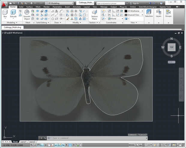 he insertado una imagen de la mariposa de la col en AutoCAD para asegurarse de que creé una representación exacta de esta mariposa, incluso el tamaño que es aproximadamente una pulgada. Luego usar tiras para trazar la forma y luego reflejarlo ya que hay una razón lógica para sacar dos partes de algo que es simétrica.