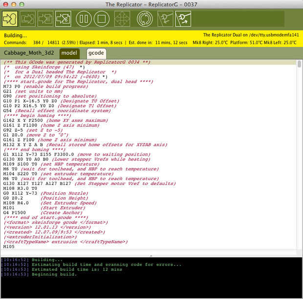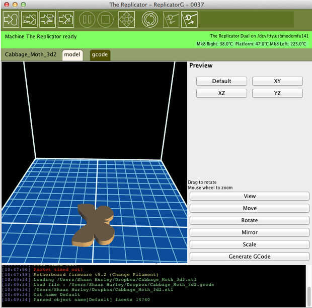 Yo importe el archivo STL y el software duplicador-G prepara el objeto 3D para generar lenguaje de máquina código de G para la impresora 3D imprimir y crear nuestro modelo físico 3D de una mariposa de la col.