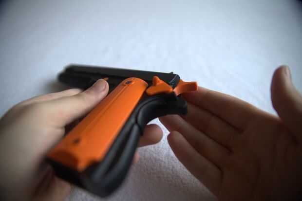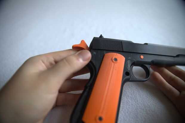 Por ahora la Asamblea es bastante autoexplicativo. Te recomiendo hacer primero el martillo pero los agujeros permiten cualquier orden. Diseñé la cerradura de seguridad para ser un ajuste apretado así que brota hacia arriba al presionar en el modo