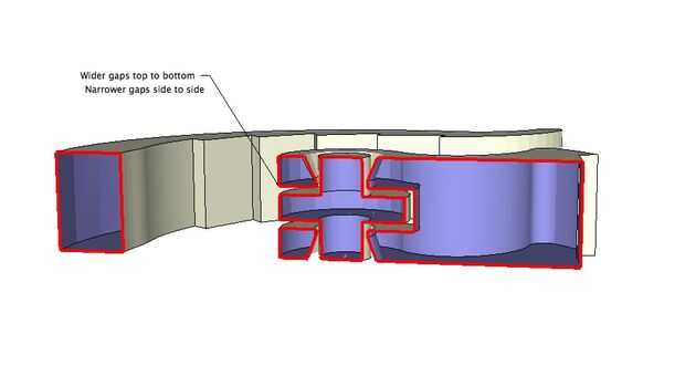 Para esta impresión, he hecho la .75mm de espacios horizontales (. 030") y los .5m m huecos verticales (. 020"). Yo también he reducido los puntos donde las dos mitades se reúnen más tanto como sea posible. Esto reduce el área superficial del plástico de la que posiblemente puede tocar y se funden. La brecha de .75mm también puede ser reducida a .500mm, pero puede aumentar la fuerza requerida para romper las partes libres y no habría ninguna ventaja de trabajo. Quiero que este primer ejemplo para ajustar fácilmente y mostrar el concepto sin lágrimas.