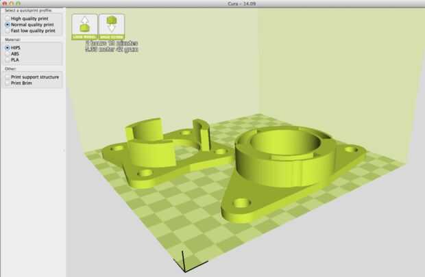 Nuestro makerspace tiene una Lulzbot Mini impresora utilizando el software de Cura. Para este paso, sólo necesitaba cargar los archivos STL generados previamente e imprimirlos para el montaje de prueba. Después de la impresión, que algunas de las juntas para un ajuste limpio de arena. Tuve una impresión fallida que tuvo que abortar y solo imprime las primera pocas capas, pero ésos sirvieron como una plantilla de patrón de perno práctico para las partes posteriores del proyecto Power Racing Series, mecanizado de accesorios piñones y discos de freno.