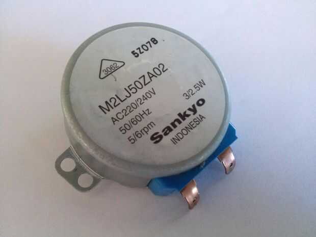 - La Lenta rotación de Motor de CA se pueden encontrar fácilmente dentro de hornos de microondas viejos con placas de giro. Estas placas están diseñadas para manejar cargas relativamente pesadas y para girar lentamente, lo que les hace ideales para este proyecto! La desventaja es que corren en voltajes más altos (red eléctrica). La mayoría de ellos tiene el mismo formato y dimensiones, que es el va a utilizar para el diseño de la base para el motor. El mío es un Sankyo 220/240VAC 2.5/3W con 5/6 rpm.