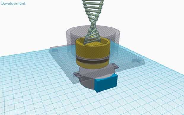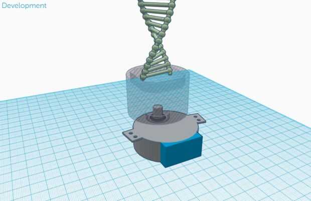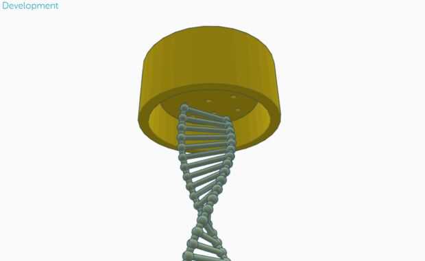 Finalmente la última pieza, el filamento de la DNA o hélice. Comencé utilizando un modelo de ADN rasguño y básicamente diseñó tubos y esferas de tamaño diferentes, mejorar los puntos débiles y ampliación de la estructura sí mismo. También he añadido las 4 columnas de soporte vertical porque esta pieza es realmente muy frágil para imprimir. Los soportes deben quitarse con cuidado después de la impresión. La base de la DNA tiene un diseño que se ajuste a la ranura de la plataforma giratoria: