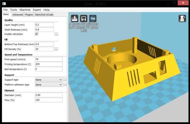 Usé la Cura para mi software de la máquina de cortar. La configuración de impresión era bastante normal, ya que esto fue un prototipo que opté por una calidad media, 20% relleno, 0.2 mm de altura de la capa y una velocidad de 50 a 70 mm/s. Mi tamaño de boquilla de Prusa I3 es de 0,4 mm y el tamaño de la boquilla LulzBot TAZ 4 es de 0,35 mm.