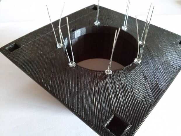 Para la parte "Base tapa" es otra vez el mismo procedimiento que antes, empezar por fijar los 7 LEDs a sus lugares y sus ánodos de soldadura juntos (terminal - más plomo positivo) creación de la principal terminal positiva (cables blancos en el esquema).