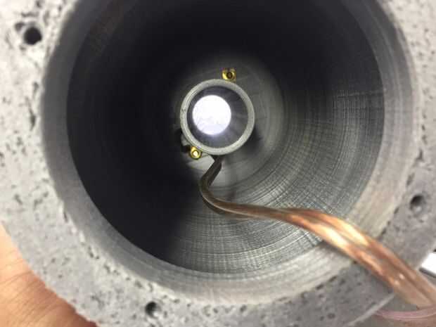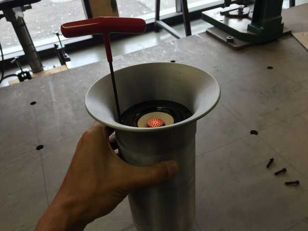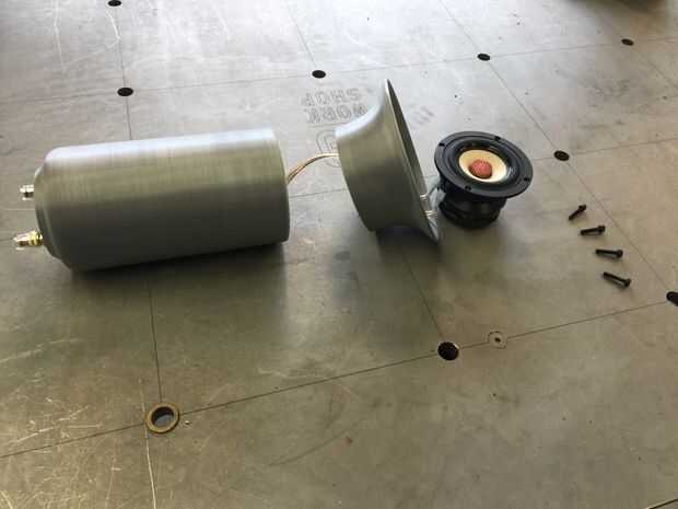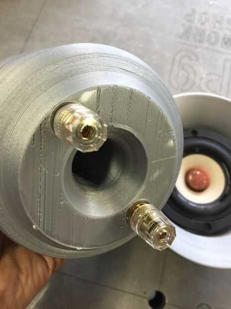 Una vez que tengas el post de unión al cable, cuidadosamente puede armar el puesto de enlace en la caja de impresión 3D. Tendrás unas pinzas de largo alcance para llegar a la tuerca en la parte inferior del altavoz para el puesto de enlace.