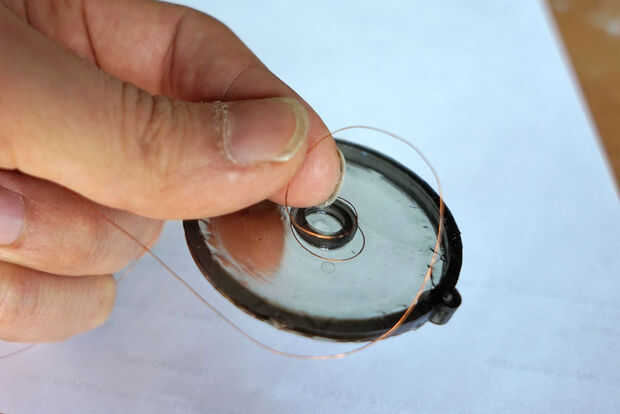 Use el alambre de cobre esmaltado para hacer la bobina. 10 a 20 revoluciones deberían ser suficiente, dependiendo del grosor del alambre. Una pequeña gota de la misma resina utilizada para las piezas de impresión se puede aplicar a la bobina para pegar al altavoz.