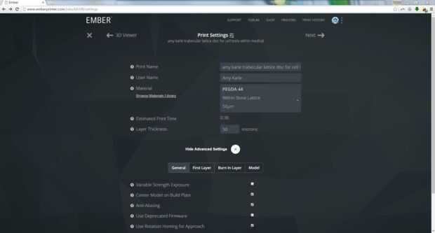Netfabb puede utilizarse para cortar el modelo (es necesario para archivos muy grandes y complejos como el diseño de mi mano), Emberprinter.com o Print Studio puede utilizarse para cortar el modelo, añadir información de la impresora y el paquete de manera que pueda entender la impresora.