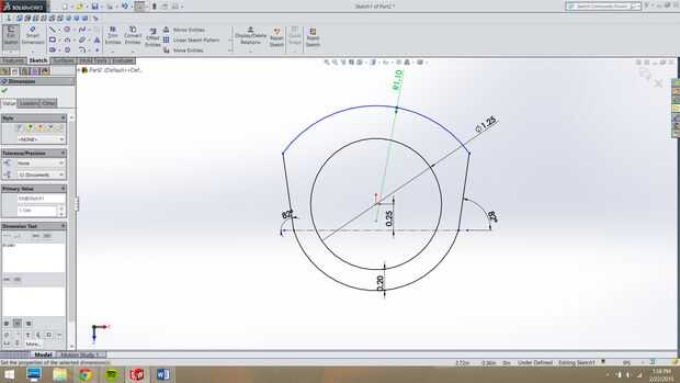 Utilice la herramienta de arco de 3 puntos para conectar las dos líneas. Entonces la dimensión de su agrado. En este caso le dio un radio de 1,10 pulgadas. Ahora el primer bosquejo es completado.