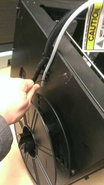 Empezar mi poner la bobina del filamento en la parte posterior de la máquina. Asegúrese de que el extremo del filamento está en la parte posterior del carrete para asegurar la alimentación adecuada. También asegúrese de que el extremo del filamento no está deformado como el de la foto es. Si se es simplemente cortarlo con un par de tijeras.