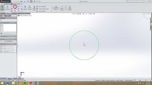 Para empezar vamos a hacer el círculo del anillo que se coloca sobre el dedo. Seleccione la herramienta de círculo de centro (Fíjate en el círculo rojo resaltado) en el Sketch manager y haga clic en el origen (las flechas rojas en el centro). Se ajustarán al origen que se utilizará como punto de referencia para la acotación más. Una vez haya hecho clic en el origen, basta con arrastrar hacia el exterior para crear el círculo.