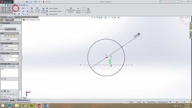 Una vez que ha establecido el diámetro deseado, seleccione la flecha situada junto a la herramienta de línea (Fíjate en el círculo rojo de highligted) y haga clic en la opción desplegable etiquetado como "Línea central". Crear una línea horizontal por debajo del origen. Mantenga pulsada la tecla Mayús mientras arrastra la línea para que sea completamente plana. Esto es una línea de construcción y no creará ningún geometrías 3D, sin embargo, puede utilizar estas líneas de construcción de puntos de referencia. Seleccione la herramienta "Smart Dimension" otra vez y haga clic en el origen y la línea de construcción que acaba de hacer. Establezca el valor a 25 pulgadas.