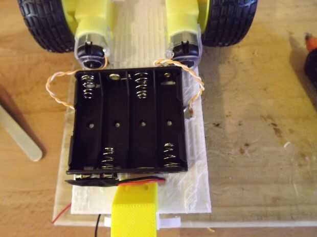 - Pegamento caliente el portapilas a la bajo lado del robot donde caben, espacio es un poco apretado en allí!