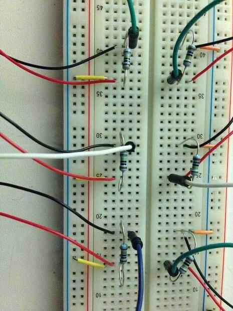 Todo el tablero está conectado a tierra a la Arduino usando el puerto GND del lado analógico. Los dos lados de la Junta reflejan mutuamente. Utilicé los cables del puente pequeño a tierra cada sensor y las resistencias de 1M ohm entre los sensores y el microcontrolador.