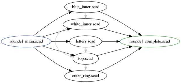 También se puede ver que todas las piezas se ramifican de la pieza original (flechas negras) del paso 2, roundel_main.scad. Esto es porque cada pieza, combinado, conforma el conjunto. La parte entera, o roundel_complete.scad, es el producto final.