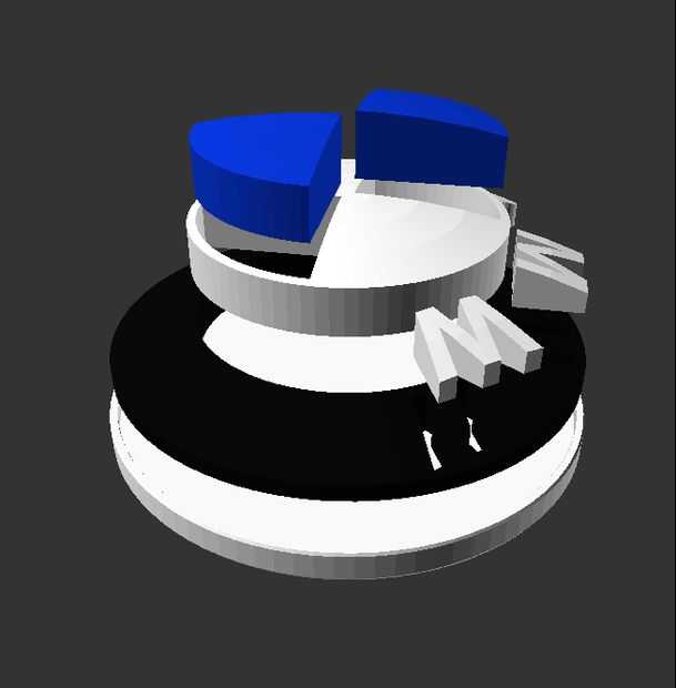 Esto es donde el archivo roundel_complete.scad . ¿Aviso cómo todas las piezas en el paso anterior eran blancas, mientras que algunos realmente se imprime en negro o azul? Eso es sólo porque el color por defecto del editor que levantado en OpenSCAD es blanco. Pero en roundel_complete.scad, las piezas de colores y agregó todos juntos.
