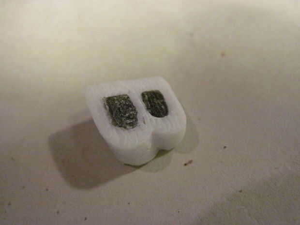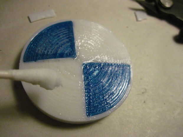 Entonces inserté las piezas azules en la parte blanca interior. Parece un poco brillante en la foto, porque separaron de acetona en la parte superior e inferior con un q-Tip. Esto ayuda a las partes azules quedarse un poco mejor, y también hace la mirada de la parte más pulida. Por favor use la acetona en algún lugar bien ventilada, para que no daño a sí mismo.