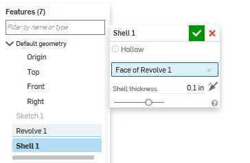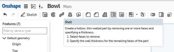 Ahora tenemos que ahuecar nuestro objeto. Usando la herramienta shell , puede seleccionar fácilmente la cara de giran en uno y ahueque hacia fuera! Después de seleccionar una cara, editar el ancho de la concha para el grosor de su tazón de fuente deseado. Tenga en cuenta que un recipiente más fino más endeble pero se imprimirá usando menos materiales.