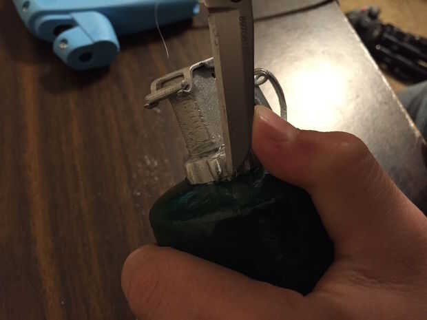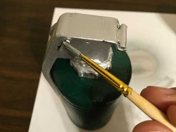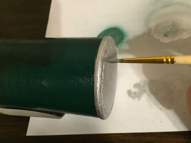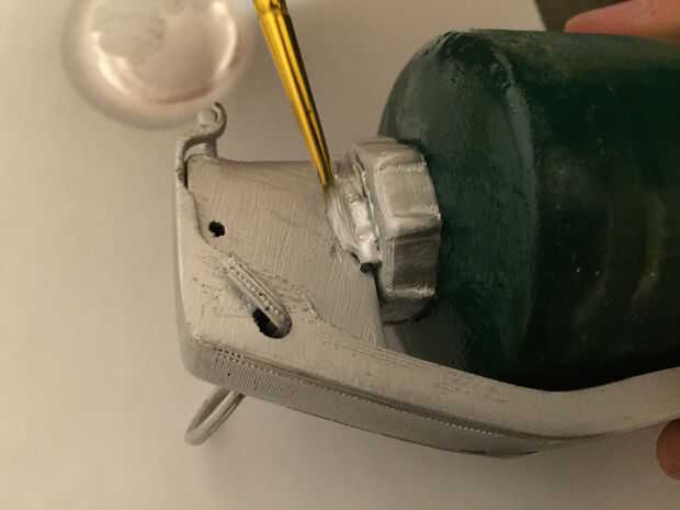 Utilizando el cuchillo, cuidadosamente raspe cualquier pegamento que no desea. Entonces, puesto que casi siempre hay partes donde la pintura no ir en, o la pintura consiguió dañada, necesita retocar la bomba de humo. Lo que hice es aerosol de la pintura sobre un trozo de papel y use una pintura de punta fina cepillo para pintar en donde pintar el spray no consiguió. También se necesita pintar la soldadura caliente del pegamento y el extremo del perno. También decidí hacer algunos arañazos usando el cuchillo como en cuadro 6.