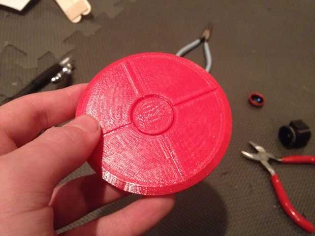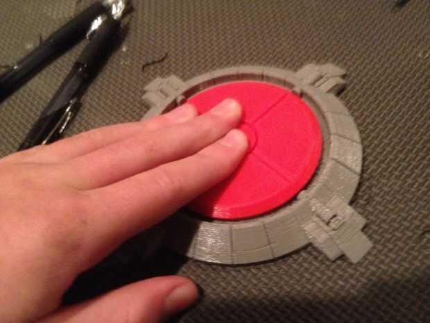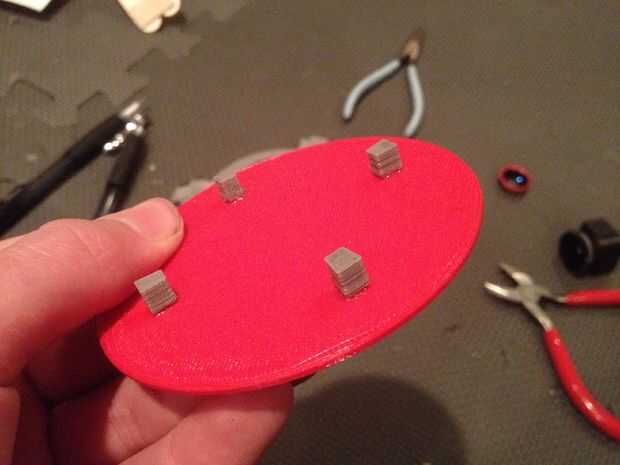 Deslice las clavijas en las ranuras más pequeñas en la pieza inferior, asegurándose de que estén correctamente orientados (deben deslizar fácilmente en y hacia fuera. Si no, compruebe si se giran incorrectamente y pruebe les lijado un poco). Debe apenas sobresalen de sus ranuras. Frote un poquito de epoxy en la parte superior de cada uno, asegurándose de no pegar en la base. Coloque el botón rojo, alineando las ranuras con las abrazaderas en la base. Espere un minuto y luego voltear todo rápidamente. Levante la base y lo un poco para obtener el botón superior para caer suavemente en la mesa mueva. Todas las clavijas deben ser espaciados uniformemente en intervalos exactos (si no intentarlo). Espere a que seque antes de manipularla.