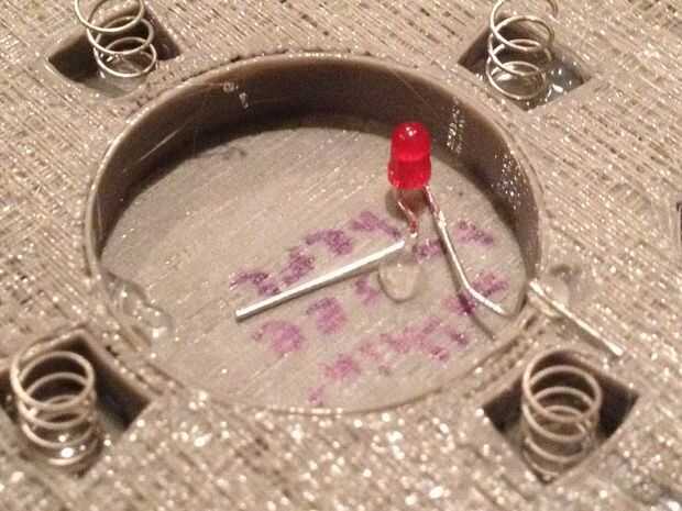 Usé un LED rojo muy pequeño. Tiene que ser de color rojo, otros colores (excepto blanco) no se mostrará a través de la parte superior.