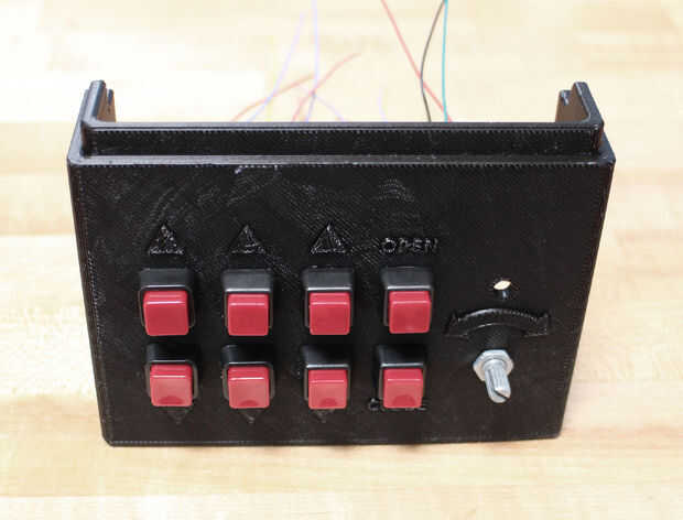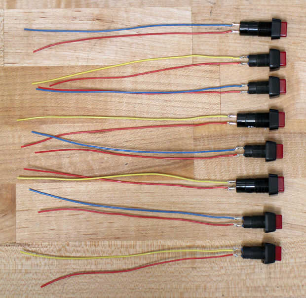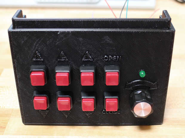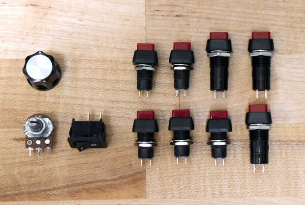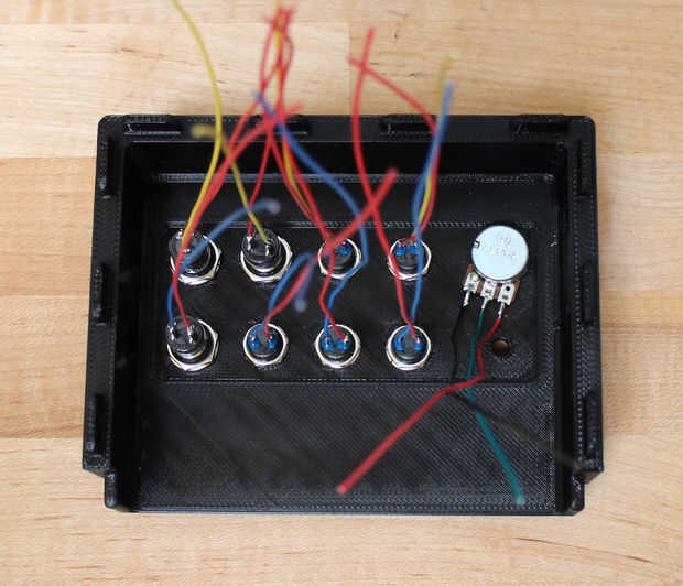 El panel de control cuenta con 8 botones, un potenciómetro, un LED y un interruptor on/off. Es más fácil soldar cables a todas las partes antes de conectar a la base (código de color de los cables: rojo = energía, negro = GND, nada más = señal). Además, agregue un resistor de 220 ohmios para el extremo del cable positivo del LED.