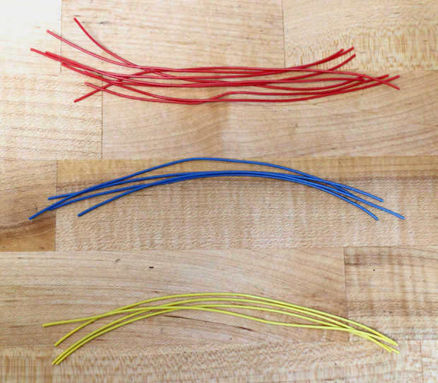 A continuación, agrupar algunos de los alambres juntos. Todas las líneas de energía de 5V de los botones se alimenta de uno de los pines en la placa de circuito. Las 8 líneas de señal deben soldarse a un conector macho - uso un orden lógico para hacer un seguimiento de qué botón que es (ver la foto para la orden que utiliza).