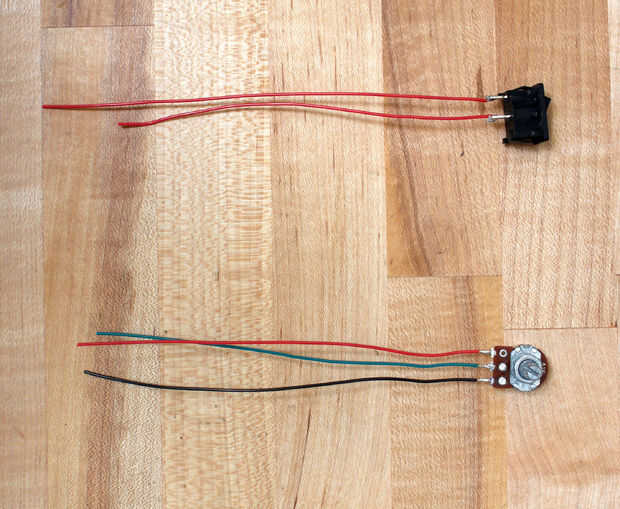 Los botones y el potenciómetro que utilicé fueron roscados y pude perno alrededor de la base. El LED y encendido/apagado ambas encajan en la base. Uno de los cables del interruptor de alimentación el orificio en el lado y torcer un hilo negro alrededor de él (este cable negro será fuente de tierra para el circuito). Una vez que las piezas se insertan, coloque la perilla del potenciómetro.