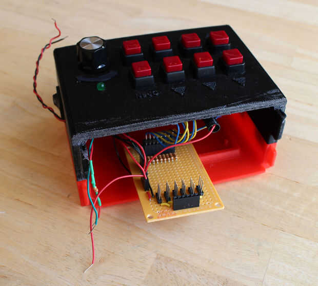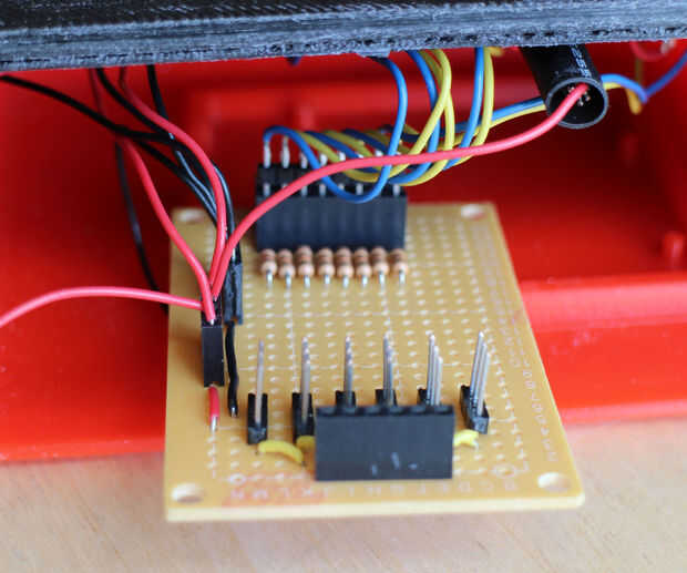 En este punto, simplemente conecte los cables desde el panel de control en el circuito. La cabecera va a la fila de conectores hembra justo debajo de las resistencias (una a continuación de irá al Arduino). Los 5V desde el potenciómetro y los botones de ir a las cabeceras de 5V. Tierra desde el potenciómetro, el LED y el cable negro van a los encabezados GND.